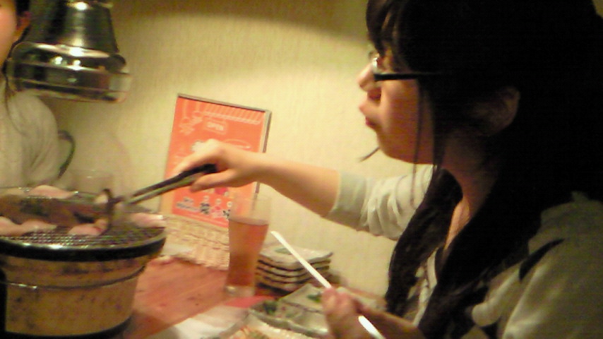 左手で焼けた肉を取りもぐもぐ